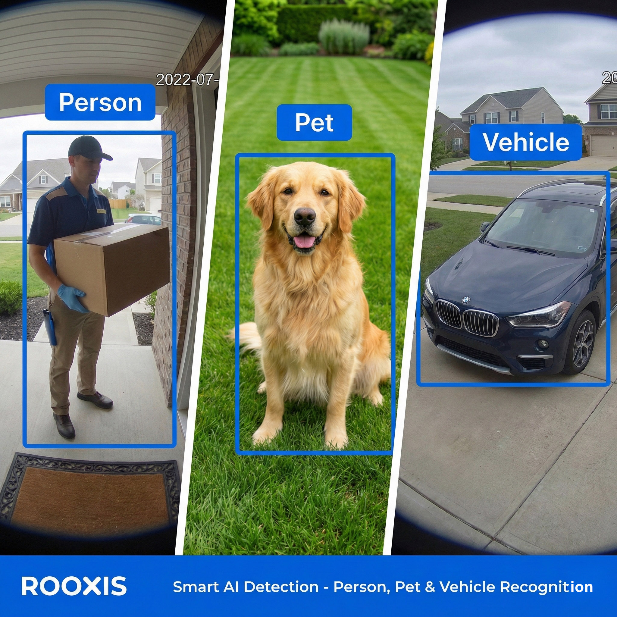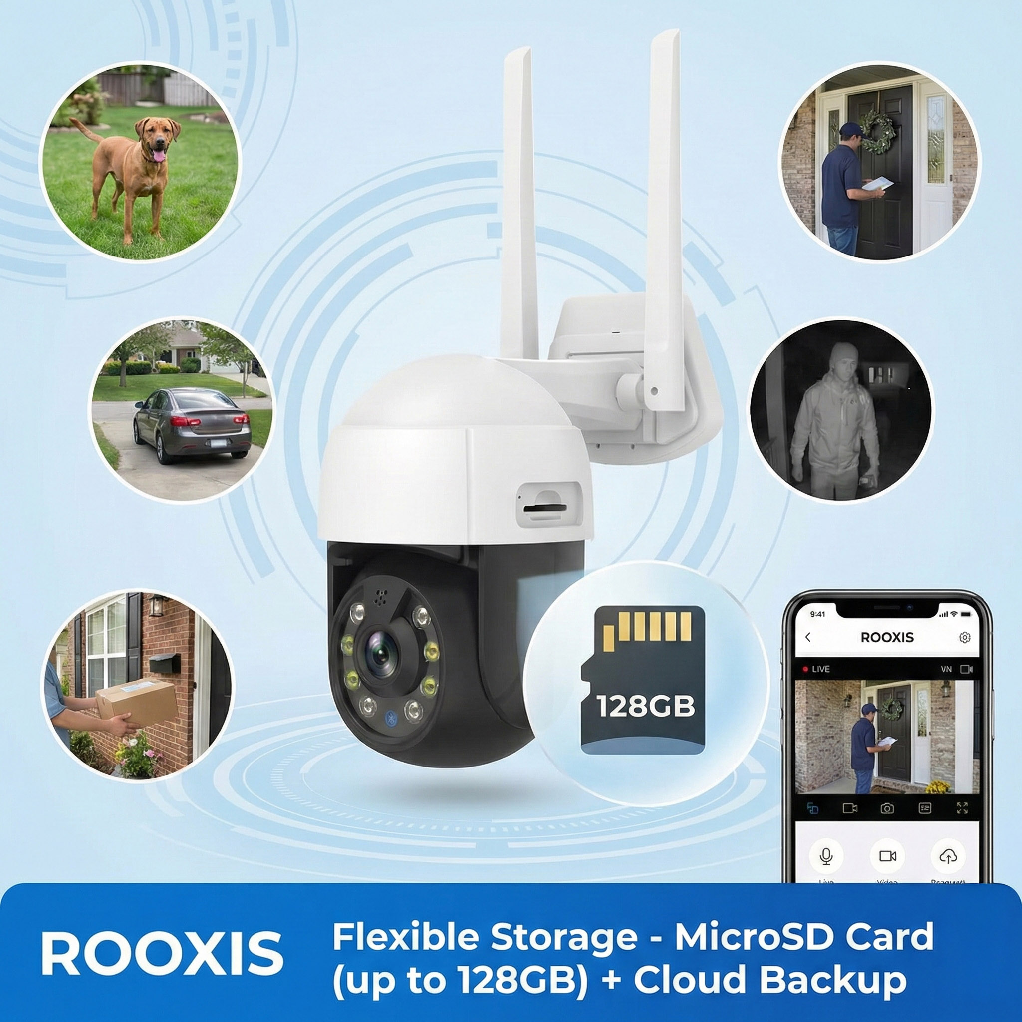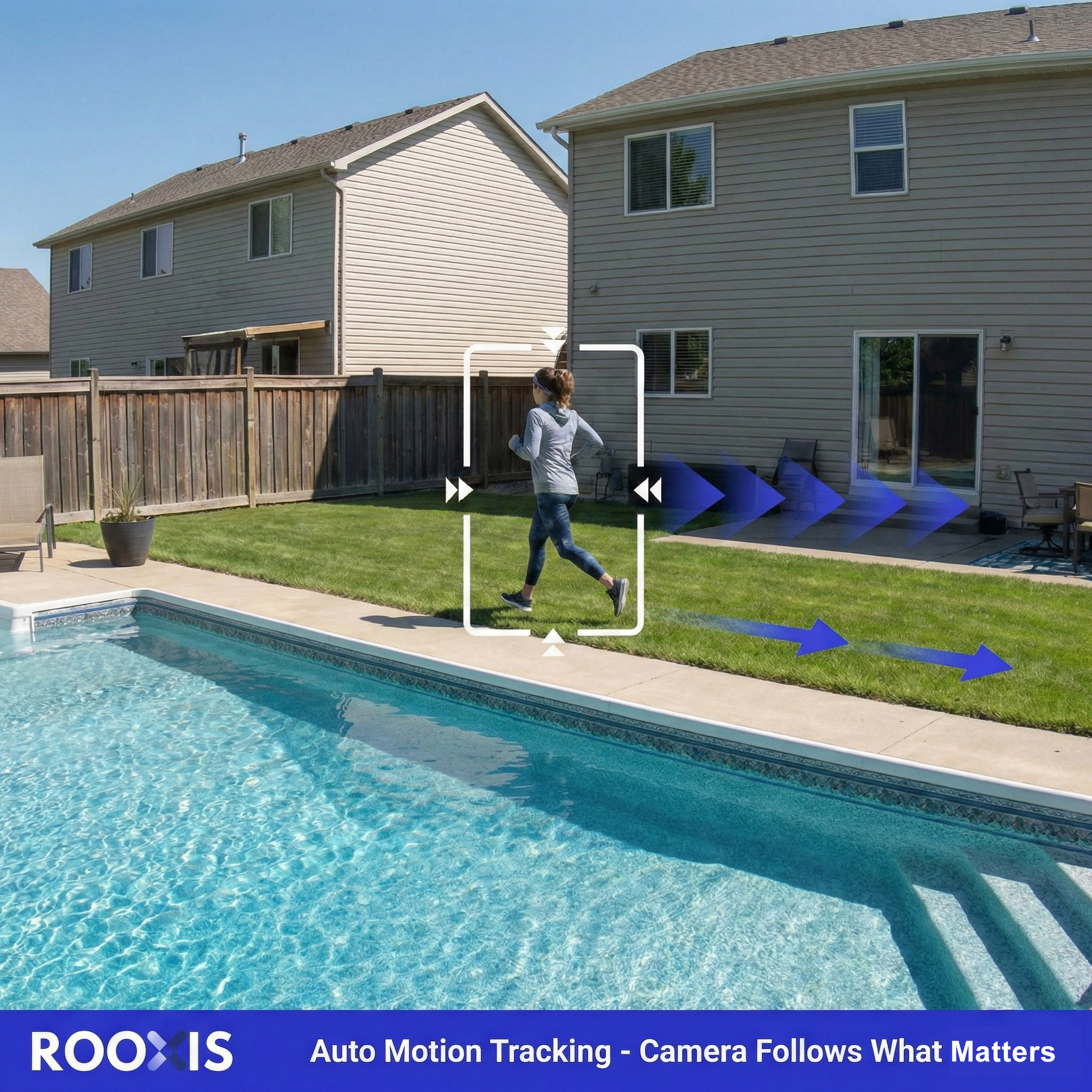 Protect your home with the ROOXIS 3K Outdoor Security Camera. Featuring ultra-clear video, 355° pan-and-tilt coverage, AI-powered human detection to reduce false alerts, color night vision up to 20 meters, two-way audio, and IP66 weatherproofing. Compatible with Alexa for voice control.